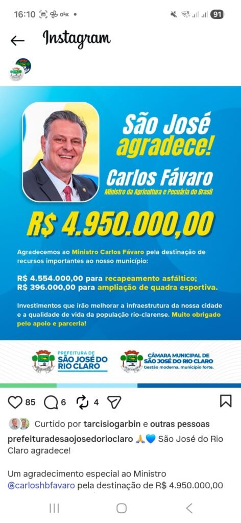 O vereador José Roberto da Silva (Betin), do Partido Novo, cometeu uma gafe ao usar a tribuna da Câmara Municipal na ultima quarta-feira (25) ao afirmar que o prefeito de São José do Rio Claro Levi Ribeiro (PL) não teria agradecido o envio de R$ 4,9 milhões destinados ao município pelo ministro da Agricultura e pecuária, Carlos Fávaro.